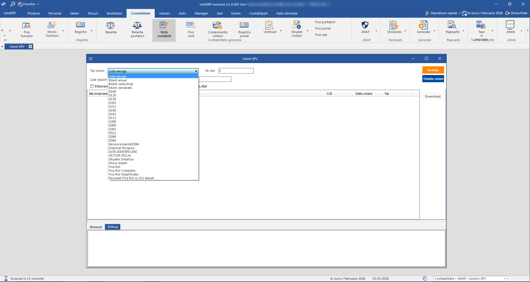 Modulul de contabilitate are acum integrare completă cu ClientSPV — poți depune și gestiona declarațiile fiscale direct din solviERP, fără să schimbi aplicația.