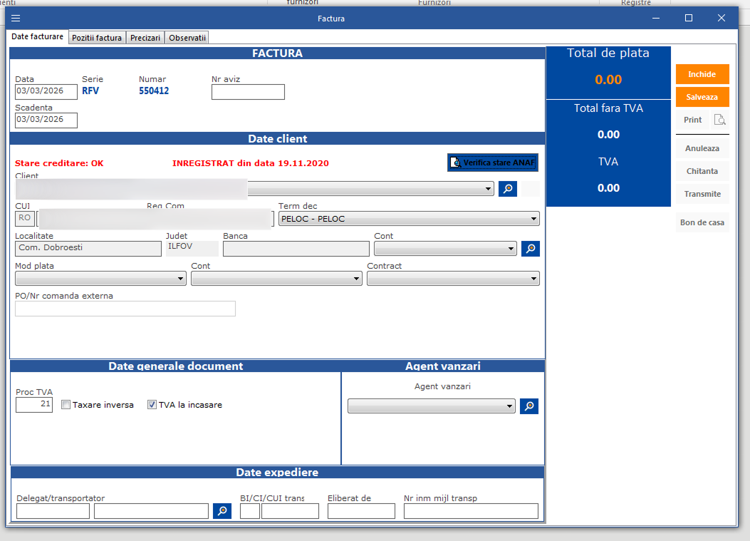 Fereastra de factură arată mai curat și mai aerisit — informațiile sunt mai bine organizate, câmpurile importante sunt mai ușor de găsit, iar lucrul cu facturi devine mai rapid.
