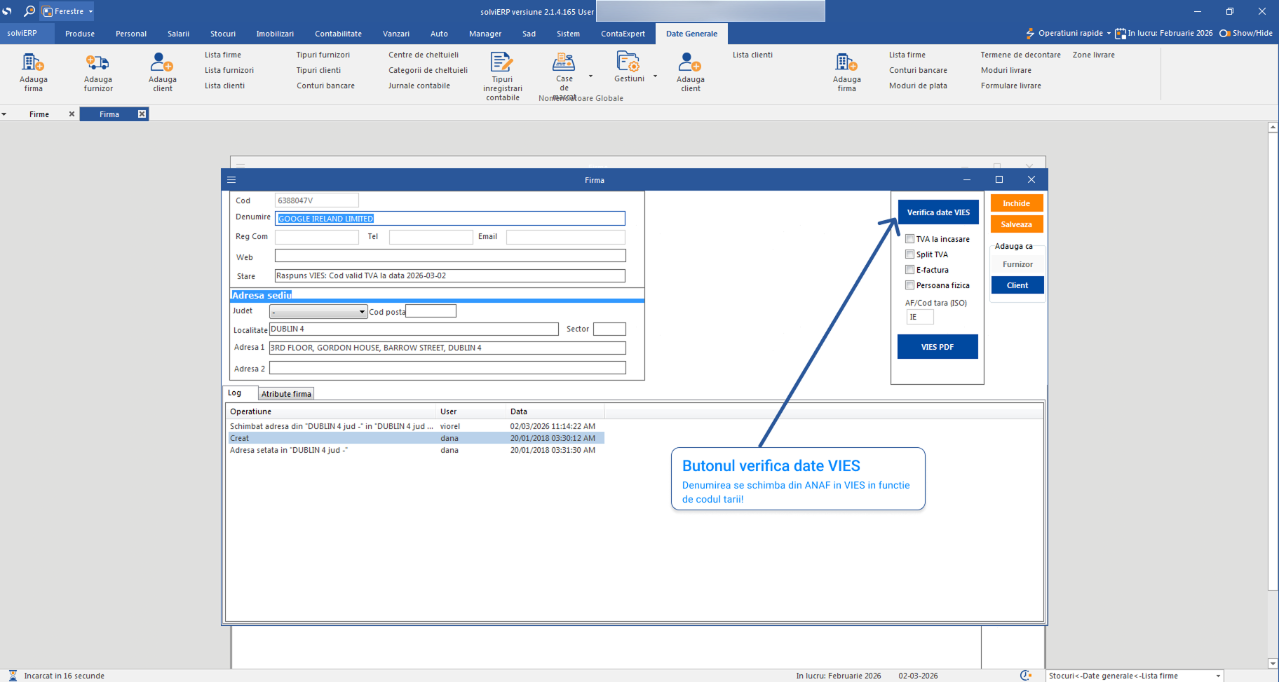 În fereastra Firmă, pentru parteneri din UE: programul verifică automat dacă codul de TVA este valid în baza de date europeană VIES. Pentru unele țări aduce și numele și adresa firmei. Poți genera un PDF cu confirmarea validității.
